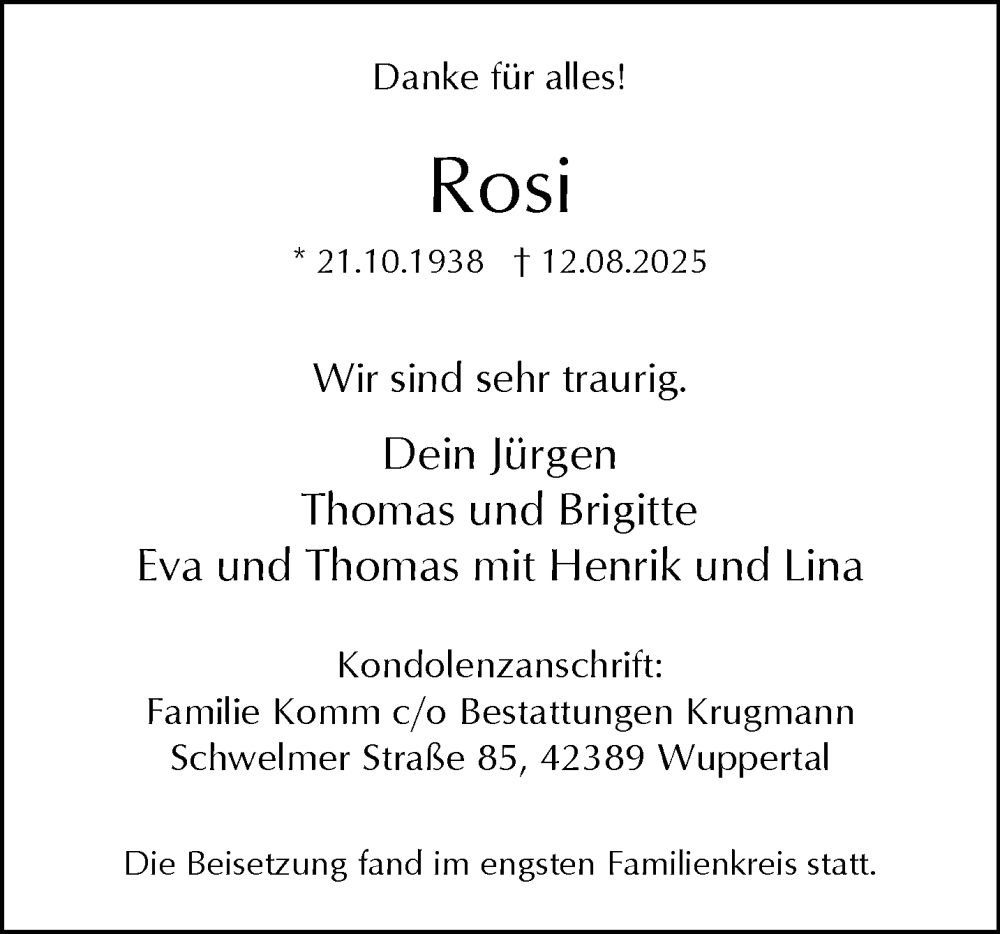 Hier finden Sie alle Traueranzeigen aus der Zeitung, die bisher für Rosi erschienen sind. Weitere Traueranzeigen, die in der Zeitung erscheinen, werden hier ebenfalls aufgelistet
