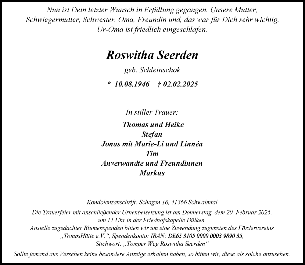 Hier finden Sie alle Traueranzeigen aus der Zeitung, die bisher für Roswitha Seerden erschienen sind. Weitere Traueranzeigen, die in der Zeitung erscheinen, werden hier ebenfalls aufgelistet