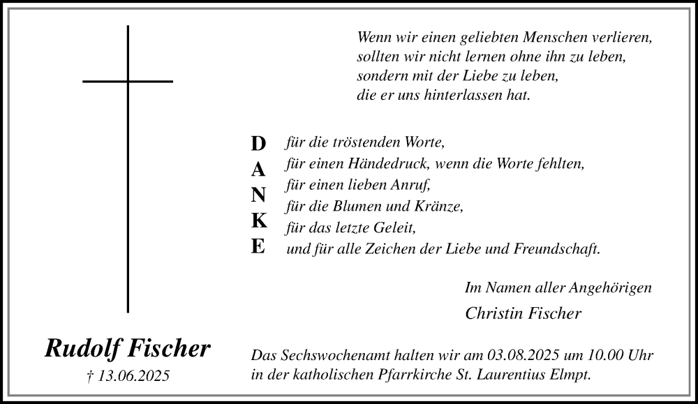 Hier finden Sie alle Traueranzeigen aus der Zeitung, die bisher für Rudolf Fischer erschienen sind. Weitere Traueranzeigen, die in der Zeitung erscheinen, werden hier ebenfalls aufgelistet