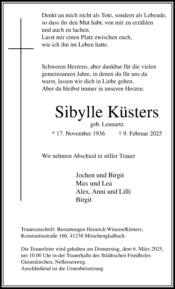 Hier finden Sie alle Traueranzeigen aus der Zeitung, die bisher für Sibylle Küsters erschienen sind. Weitere Traueranzeigen, die in der Zeitung erscheinen, werden hier ebenfalls aufgelistet