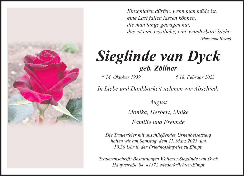 Hier finden Sie alle Traueranzeigen aus der Zeitung, die bisher für Sieglinde van Dyck erschienen sind. Weitere Traueranzeigen, die in der Zeitung erscheinen, werden hier ebenfalls aufgelistet