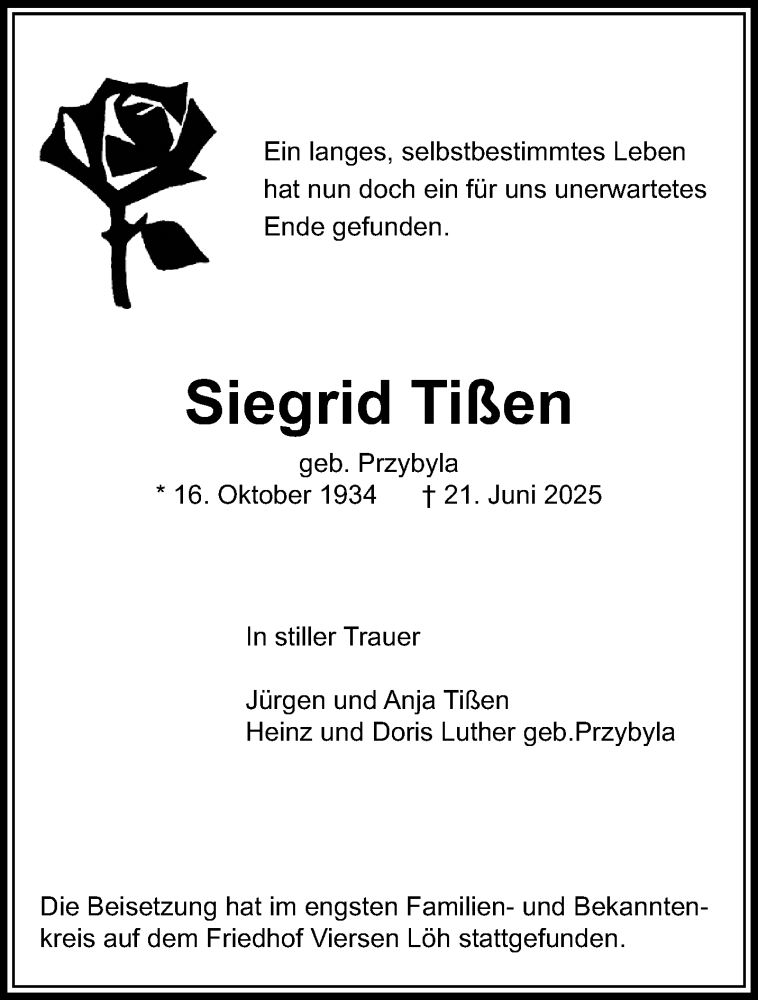 Hier finden Sie alle Traueranzeigen aus der Zeitung, die bisher für Siegrid Tißen erschienen sind. Weitere Traueranzeigen, die in der Zeitung erscheinen, werden hier ebenfalls aufgelistet