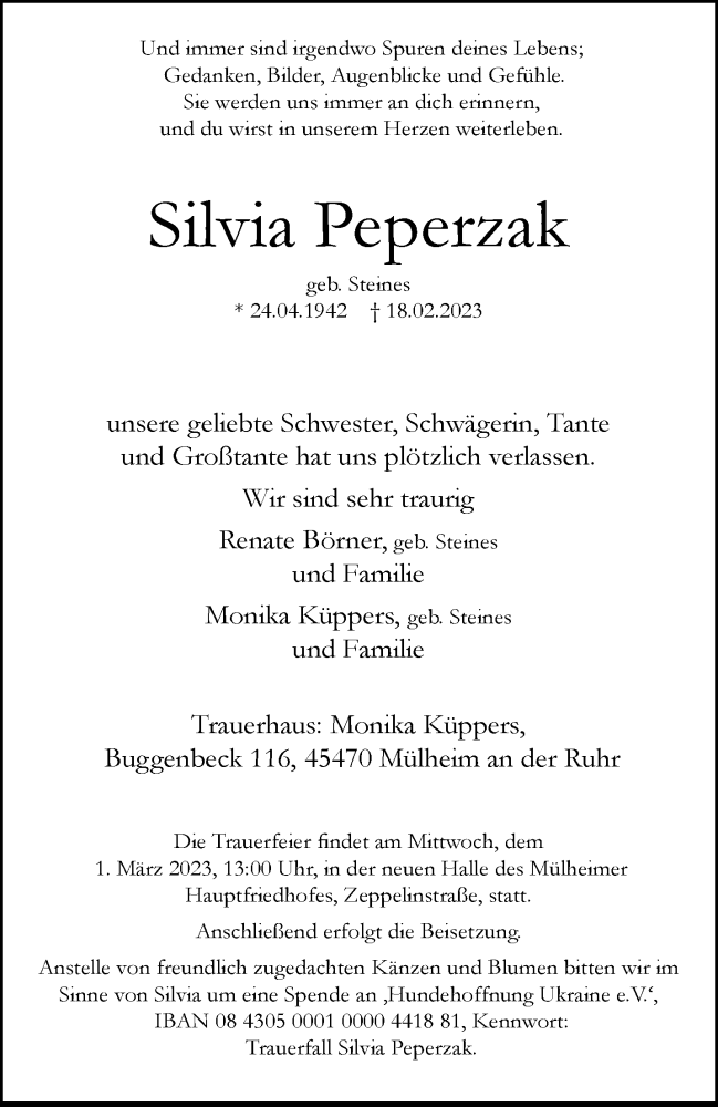 Hier finden Sie alle Traueranzeigen aus der Zeitung, die bisher für Silvia Peperzak erschienen sind. Weitere Traueranzeigen, die in der Zeitung erscheinen, werden hier ebenfalls aufgelistet