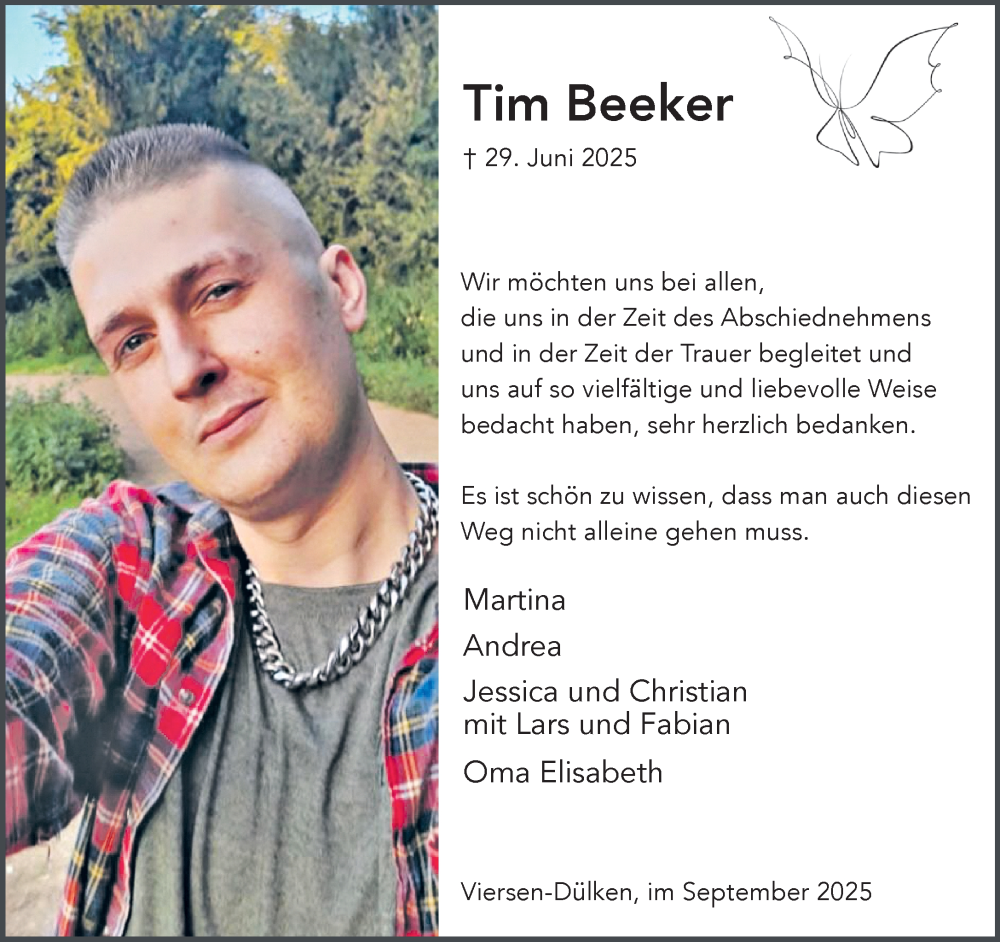 Hier finden Sie alle Traueranzeigen aus der Zeitung, die bisher für Tim Beeker erschienen sind. Weitere Traueranzeigen, die in der Zeitung erscheinen, werden hier ebenfalls aufgelistet