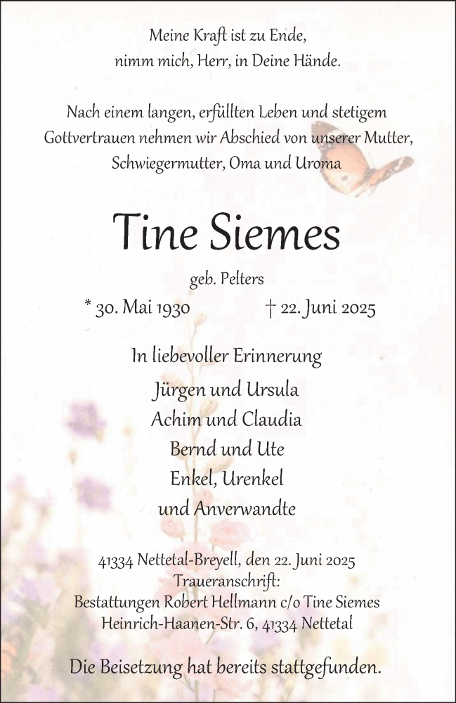 Hier finden Sie alle Traueranzeigen aus der Zeitung, die bisher für Tine Siemes erschienen sind. Weitere Traueranzeigen, die in der Zeitung erscheinen, werden hier ebenfalls aufgelistet