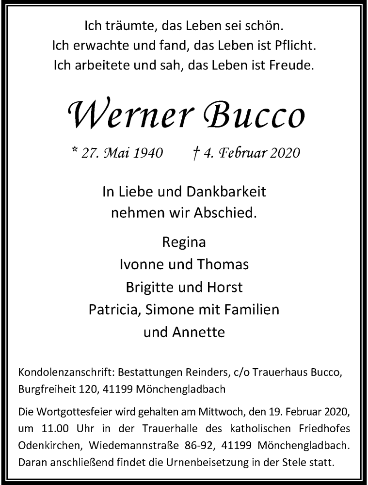 Hier finden Sie alle Traueranzeigen aus der Zeitung, die bisher für Werner Bucco erschienen sind. Weitere Traueranzeigen, die in der Zeitung erscheinen, werden hier ebenfalls aufgelistet