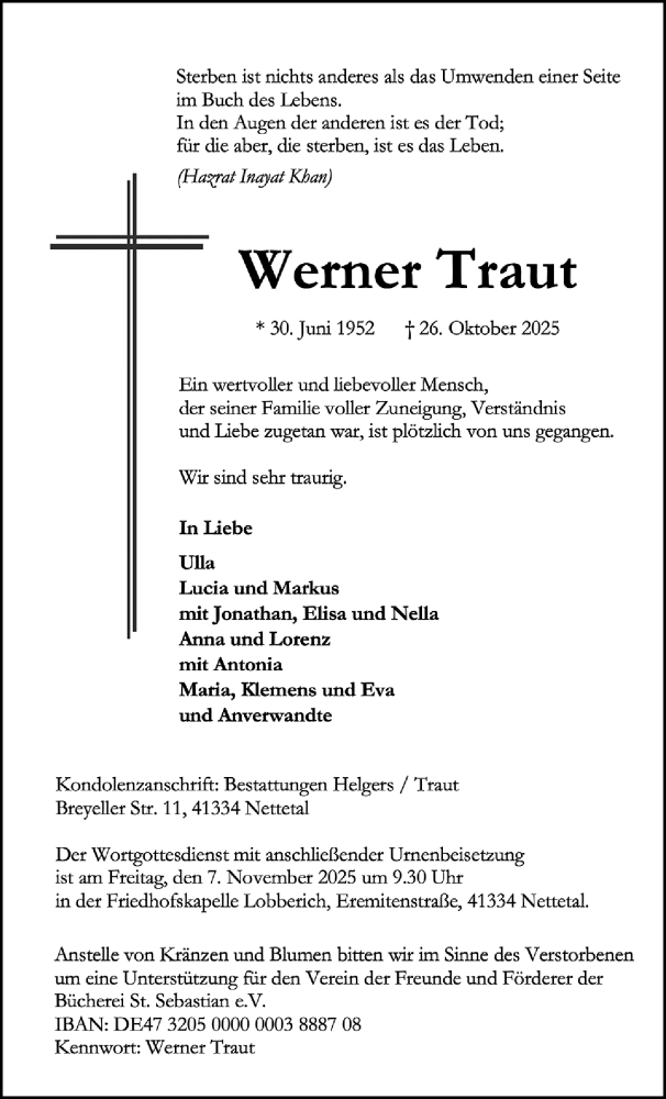 Hier finden Sie alle Traueranzeigen aus der Zeitung, die bisher für Werner Traut erschienen sind. Weitere Traueranzeigen, die in der Zeitung erscheinen, werden hier ebenfalls aufgelistet