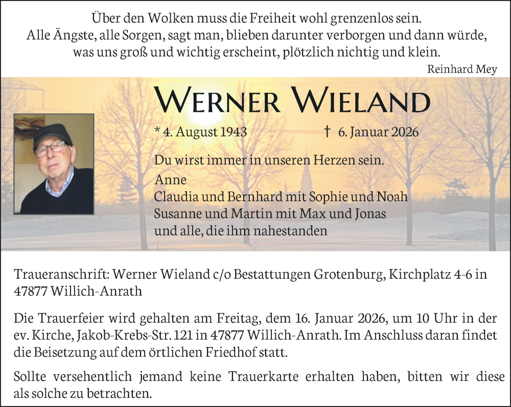 Hier finden Sie alle Traueranzeigen aus der Zeitung, die bisher für Werner Wieland erschienen sind. Weitere Traueranzeigen, die in der Zeitung erscheinen, werden hier ebenfalls aufgelistet