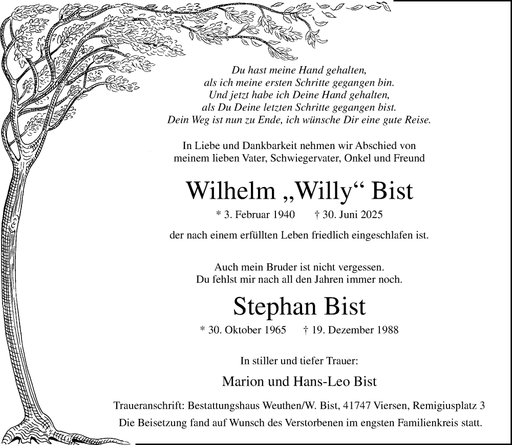 Hier finden Sie alle Traueranzeigen aus der Zeitung, die bisher für Wilhelm Bist erschienen sind. Weitere Traueranzeigen, die in der Zeitung erscheinen, werden hier ebenfalls aufgelistet