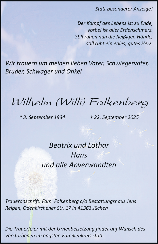 Hier finden Sie alle Traueranzeigen aus der Zeitung, die bisher für Wilhelm Falkenberg erschienen sind. Weitere Traueranzeigen, die in der Zeitung erscheinen, werden hier ebenfalls aufgelistet