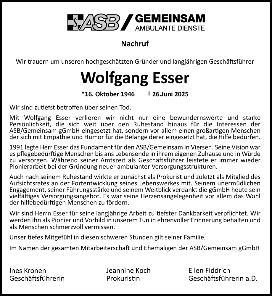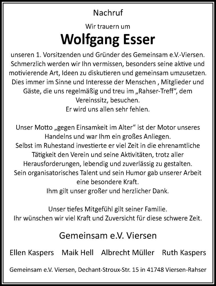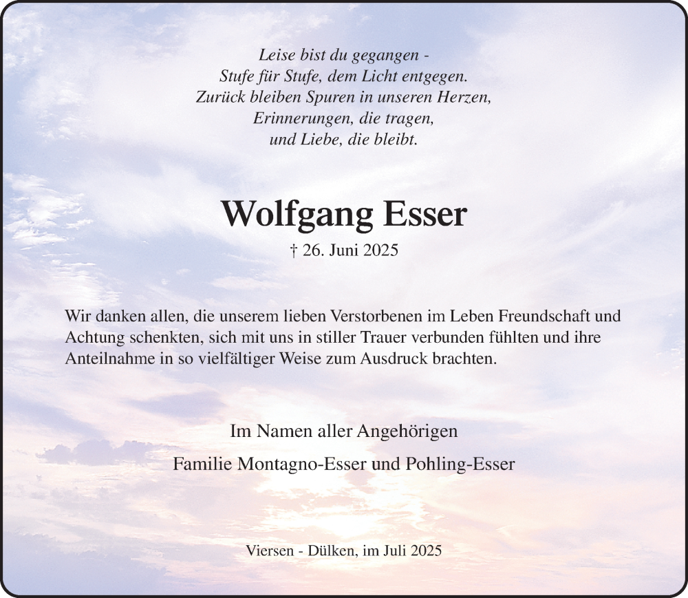 Hier finden Sie alle Traueranzeigen aus der Zeitung, die bisher für Wolfgang Esser erschienen sind. Weitere Traueranzeigen, die in der Zeitung erscheinen, werden hier ebenfalls aufgelistet