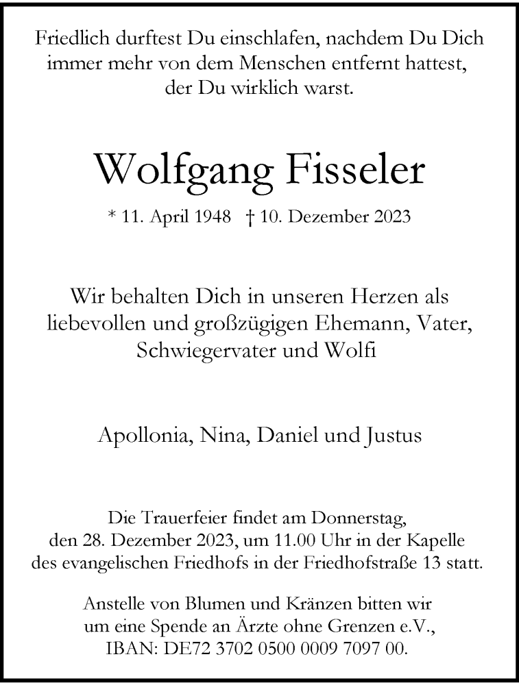 Hier finden Sie alle Traueranzeigen aus der Zeitung, die bisher für Wolfgang Fisseler erschienen sind. Weitere Traueranzeigen, die in der Zeitung erscheinen, werden hier ebenfalls aufgelistet