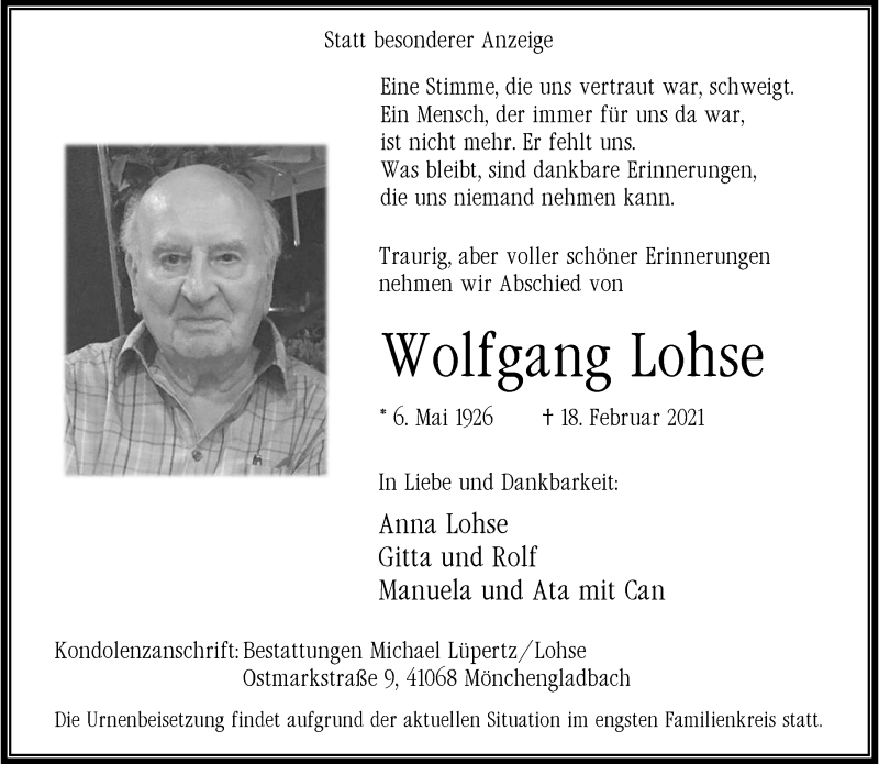 Hier finden Sie alle Traueranzeigen aus der Zeitung, die bisher für Wolfgang Lohse erschienen sind. Weitere Traueranzeigen, die in der Zeitung erscheinen, werden hier ebenfalls aufgelistet